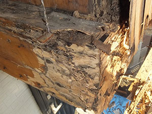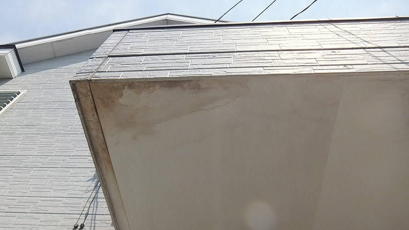1Fの玄関上ヒサシが雨漏れでシロアリ被害、下地木材を交換し仕上げは白のタイル張り。